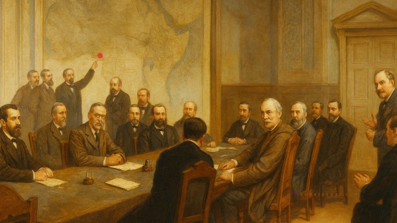Ce Congrès s’est tenu sur l’Afrique sans les Africains et réunissait treize pays européens (Allemagne, France, Belgique, Portugal, Hollande, Espagne, Italie, Danemark, Autriche-Hongrie, Empire Ottoman (Turquie), Russie, Grande-Bretagne, Suède) plus les Etats-Unis d’Amérique. (kamerpower.com)