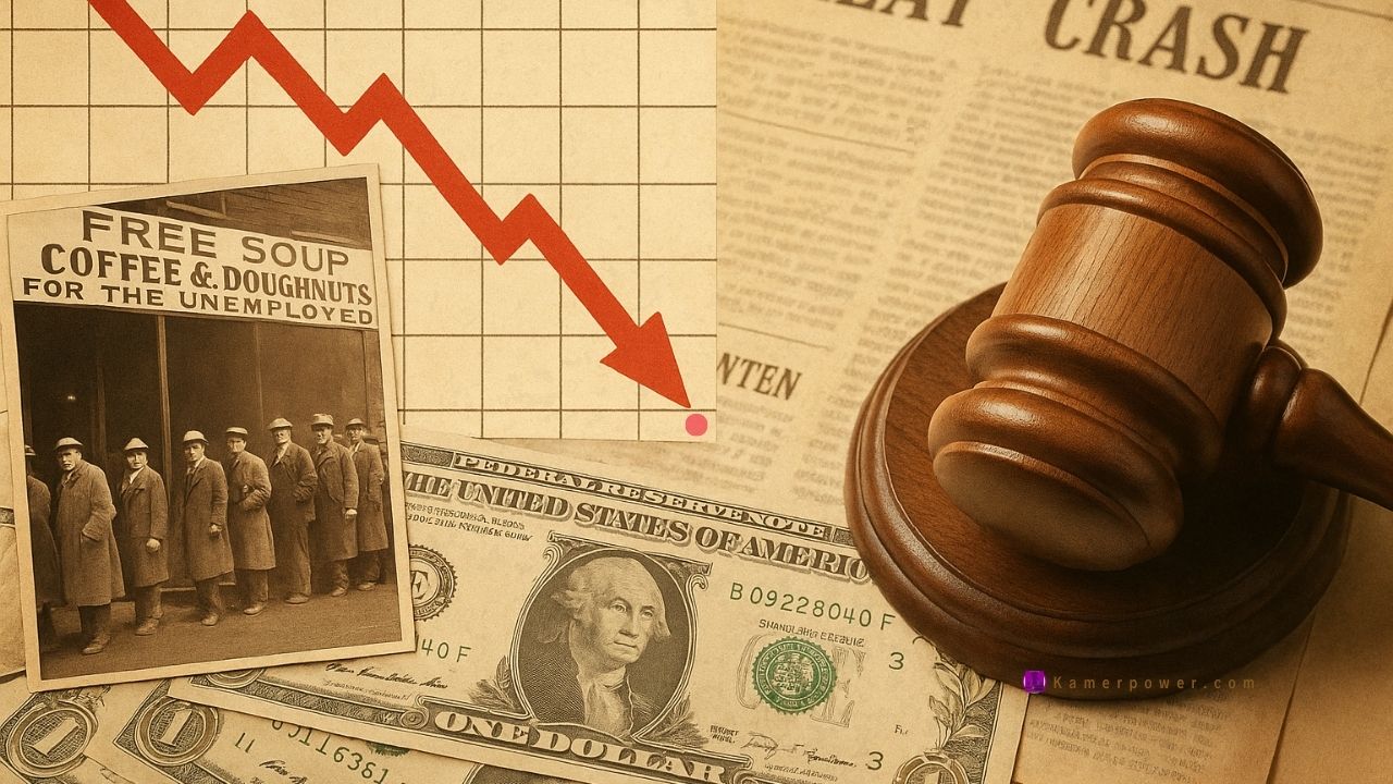 Le recours massif aux crédits bancaires et la spéculation effrénée à la Bourse fragilisent l’économie. De nombreux ménages s’endettent pour acheter des actions, espérant un profit rapide. En septembre 1929, cette bulle spéculative éclate : le krach boursier de Wall Street provoque un effondrement des marchés financiers. Parallèlement, le redressement du franc français affaiblit le dollar, accentuant la méfiance et la panique dans les milieux d’affaires internationaux.